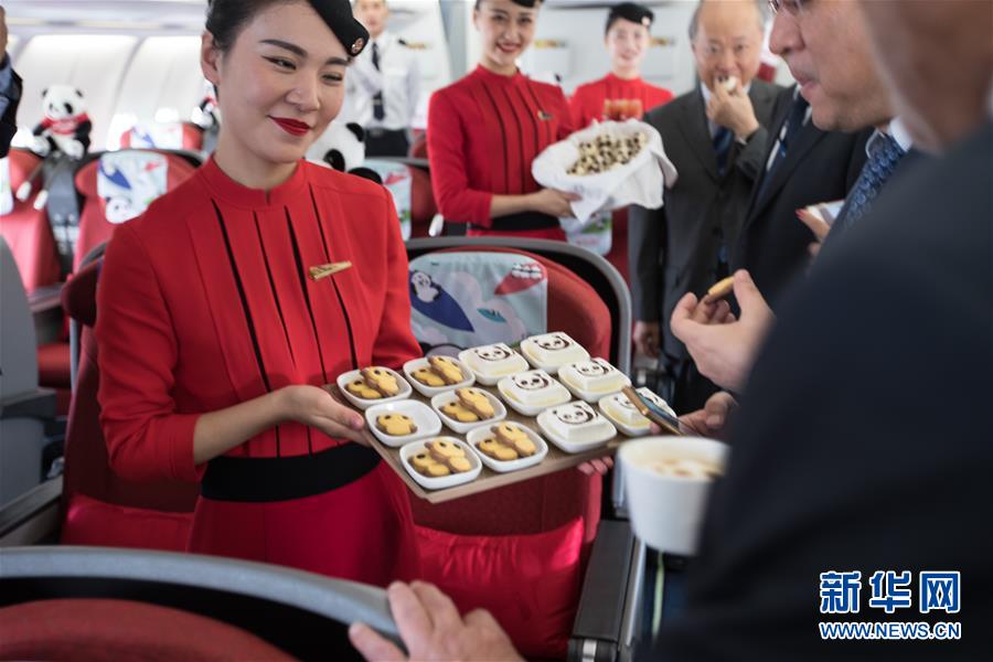 9月26日,在以色列特拉维夫本·古里安国际机场,四川航空公司空乘人员在机上展示熊猫主题的小吃。 新华社记者郭昱摄