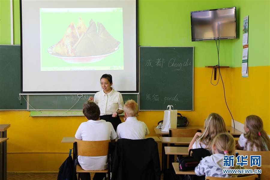 9月25日,在波兰罗兹第一小学,成都青白江区外国语小学老师李艳向波兰小学生介绍中国美食。成都青白江区外国语小学与波兰罗兹第一小学25日在波兰中部城市罗兹签署友好学校合作协议。这是继成都与罗兹2015年结为友城之后,两座城市人文交流合作的又一新成果。2013年,东起成都青白江、西至罗兹的中欧班列(蓉欧快铁)开通。5年来,来往两地的班列不断增加,有力促进了成都与罗兹在经贸、教育、文化等多领域的交流与合作。新华社记者 陈序 摄