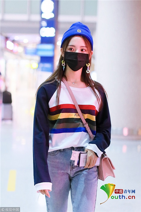 2018年9月25日,北京,“锦鲤少女”杨超越现身机场,她身穿“彩虹装”青春无敌,戴着糖果色耳环,细节处可爱吸睛。