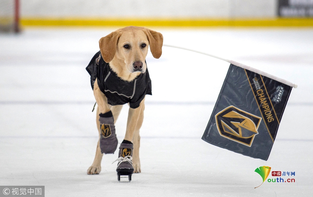 2018年9月26日讯。(具体拍摄时间不详)这只可爱的拉布拉多犬本尼是世界上第一只会滑冰的狗。
