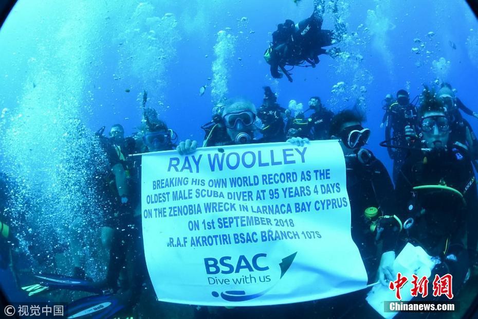 当地时间2018年9月1日,塞浦路斯,95岁的英国潜水员雷·伍利(Ray Woolley)以44分钟下潜40.5米的成绩打破了自己94岁达成的记录(41分钟下潜38.1米),二度刷新了世界上年龄最大的男性潜水员最好成绩。在此次下潜中,这位二战退伍老兵对距塞浦路斯南部城镇拉纳卡约2公里处的海域进行了探索,1980年一艘名为“芝诺比亚号”(Zenobia)的货船在这里进行首次航行时沉没。图片来源:视觉中国