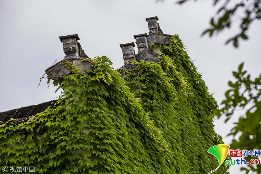 2018年5月6日,安徽省黄山市黟县秀里村郁郁葱葱、枝叶茂盛的爬山虎爬满了村里一幢幢徽派古民居,俨然一座座“绿色城堡”,绿意盎然爬山虎与粉墙黛瓦相映成趣,仿佛“绿野仙踪”。