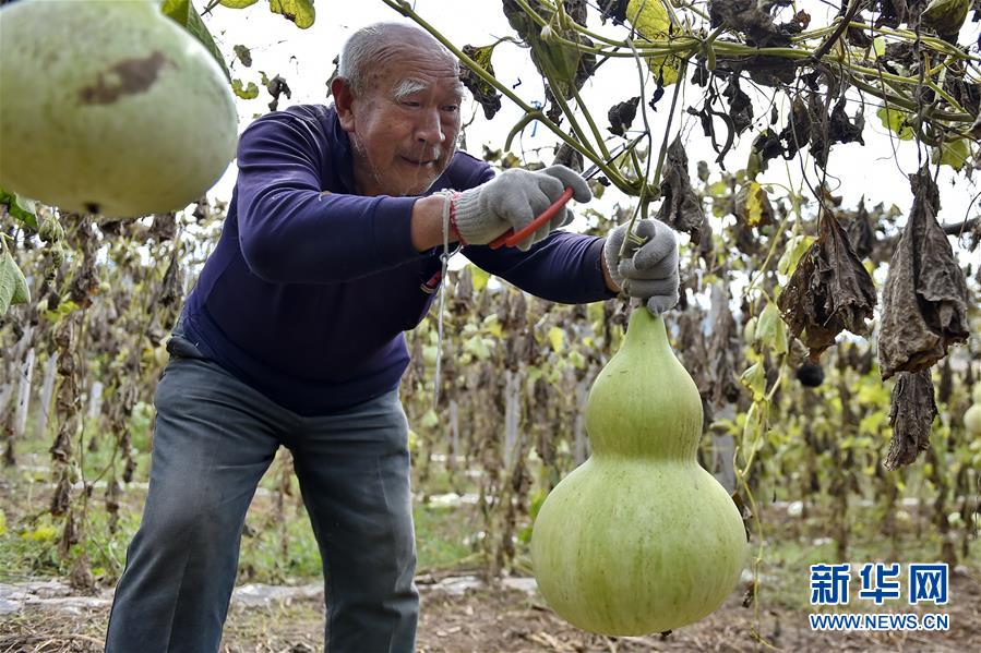 9月27日,山西省安泽县和川镇孔旺村的村民在摘葫芦。近日,山西省安泽县和川镇孔旺村种植的葫芦喜获丰收,村民们忙着将摘下的葫芦去皮晾干。孔旺村于2016年成立葫芦种植合作社,种植、采摘、加工等环节全部由贫困户负责,为贫困户拓宽增收渠道。新华社记者 曹阳 摄