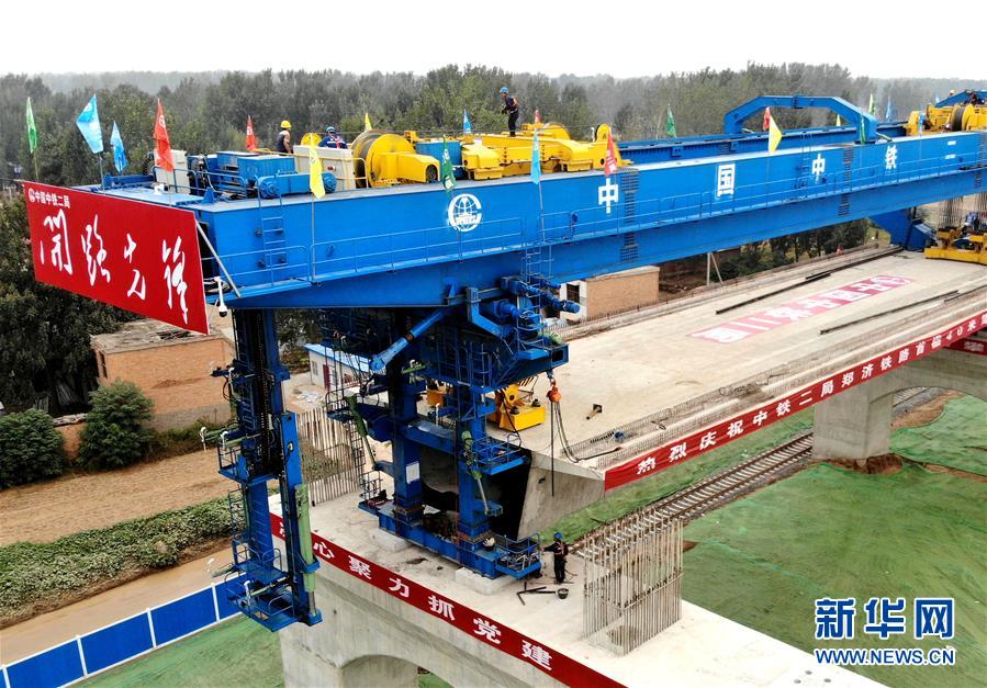 9月27日,中铁二局的施工人员使用大型机械在郑(州)济(南)高速铁路(郑濮段)站前工程VI标施工现场架设40米简支箱梁(无人机拍摄)。 新华社记者李安摄