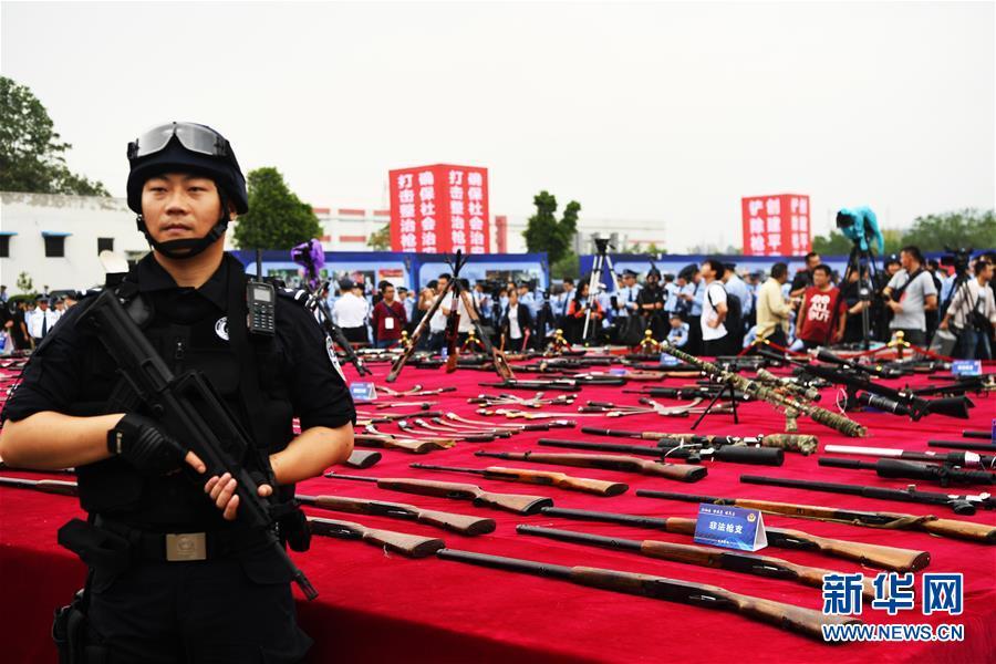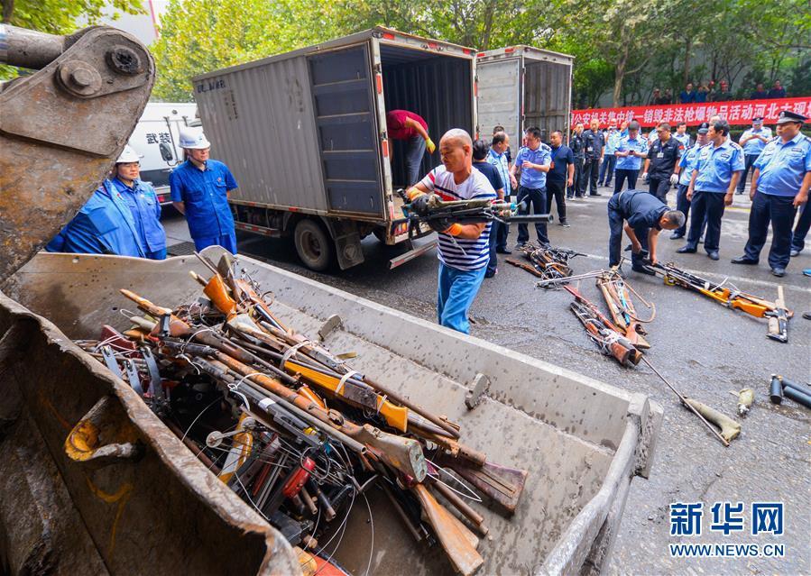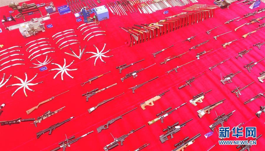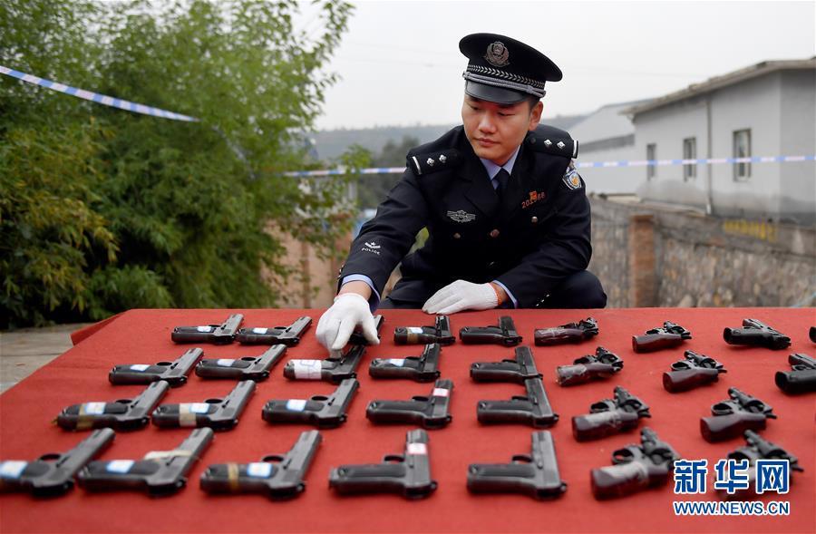 9月20日,在河北省邯郸市天鸿广场,警方展示即将销毁的非法枪支。 新华社记者 王晓 摄