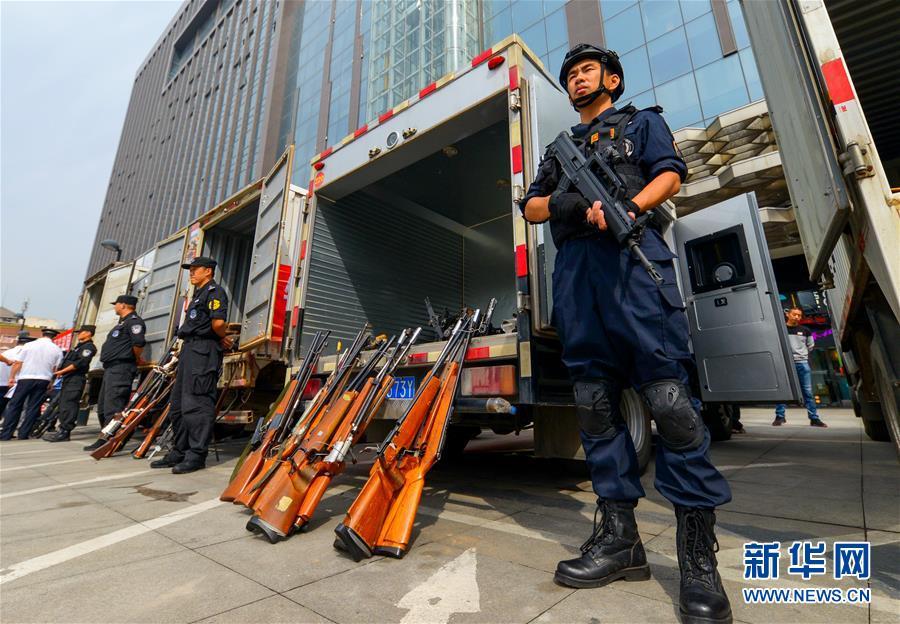 9月20日,在河北省邯郸市天鸿广场,警方展示即将销毁的非法枪支。 新华社记者 王晓 摄
