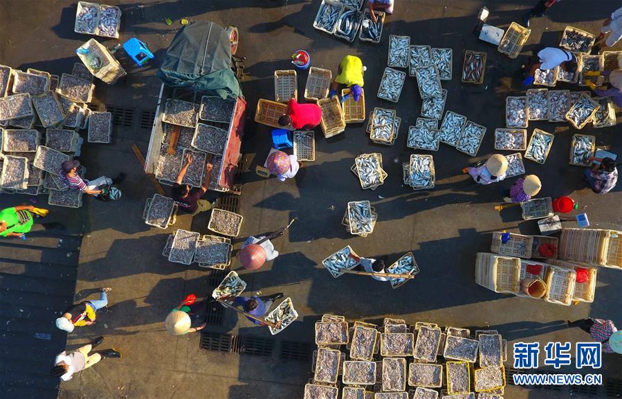返港渔民在广西北海市侨港镇电建渔港的码头卸货(9月26日无人机拍摄)。 新华社记者 黄孝邦 摄