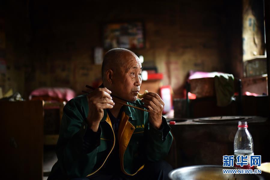 在黄崖洞烈士陵园,赵乃堂在屋里吃午饭(9月18日摄)。 新华社记者 詹彦 摄