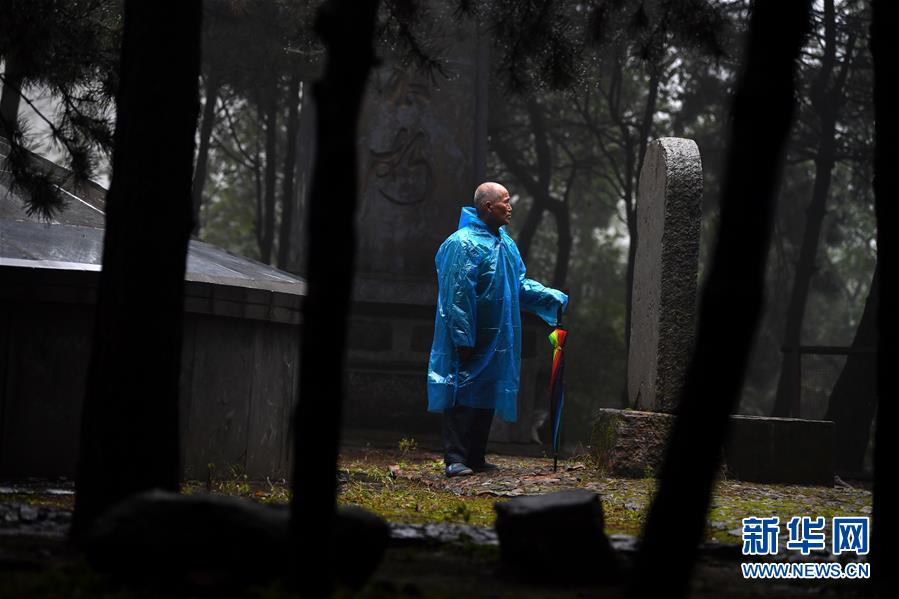 赵乃堂在黄崖洞烈士陵园烈士墓碑前肃立瞻仰(9月18日摄)。 新华社记者 詹彦 摄