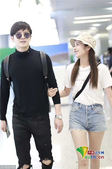 2018年9月26日,上海,颖儿、付辛博夫妇亮相机场。颖儿身穿白T恤和牛仔短裤露出纤细美腿十分养眼,一路挽着老公的手十分恩爱甜蜜,日前,颖儿还在节目上痛哭述说自己与付辛博新婚相处的苦楚。