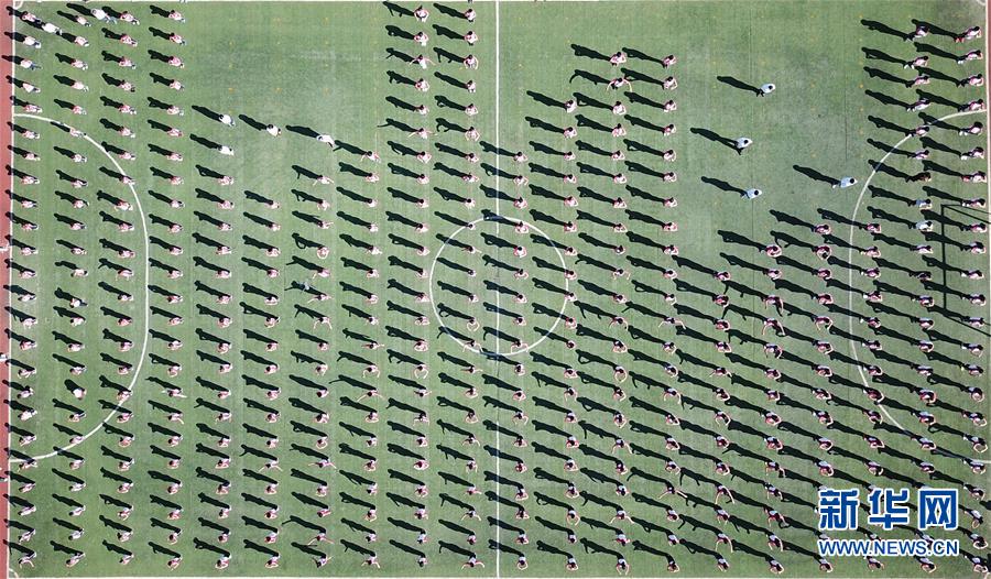 在小岗村小岗学校,学生们在体育展示课上做操(9月27日无人机拍摄)。 新华社记者 才扬摄