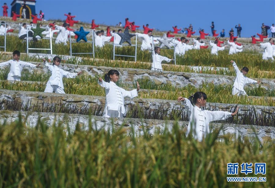 9月29日,太极拳爱好者在建德市大洋镇高垣村的千亩梯田上进行表演。当日,2000多名太极拳爱好者在浙江省建德市大洋镇高垣村的千亩梯田上参加太极拳表演,吸引很多当地人和游客前来观赏,助力当地金秋时节乡村旅游。近两年来,大洋镇充分利用土地整治后形成的千亩梯田打造农业观光综合体,发展综合型农业观光旅游,为乡村振兴注入新活力。新华社记者徐昱摄