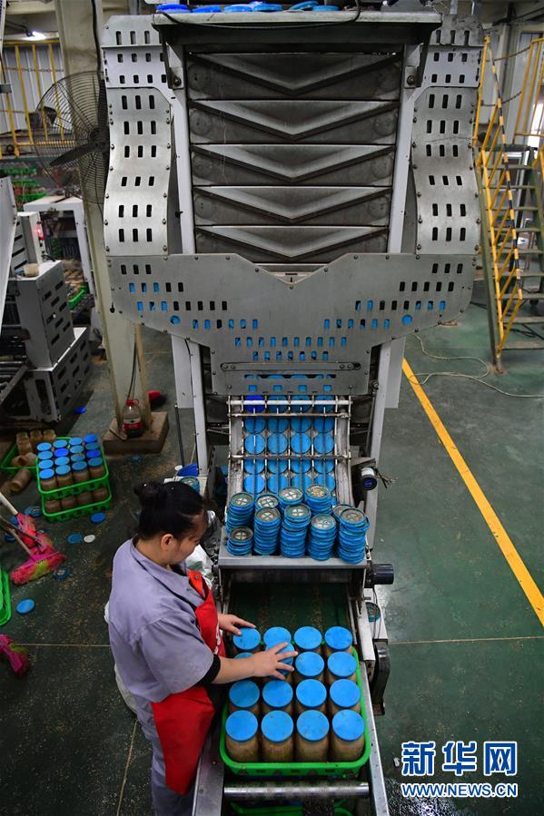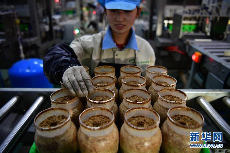 在位于清丰县的河南龙丰实业股份有限公司,一名工人在装瓶车间查看食用菌栽培瓶装瓶情况(9月28日摄)。新华社记者冯大鹏摄
