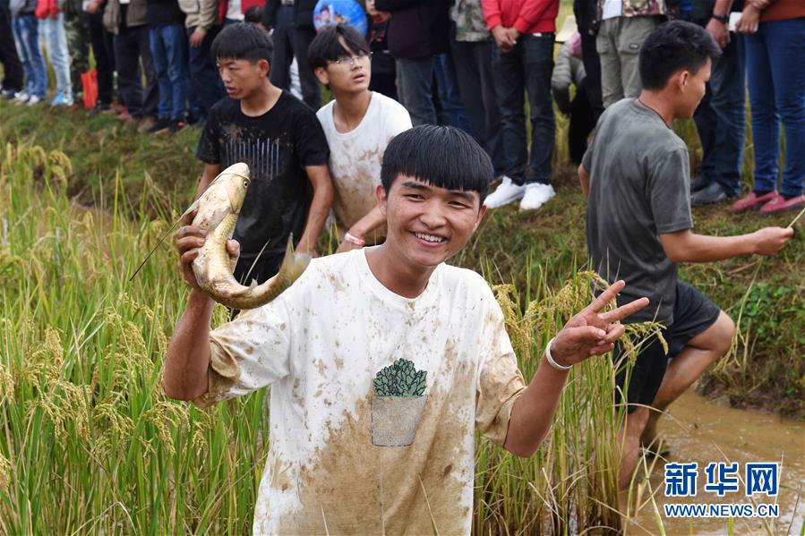 9月29日,一名小伙子展示摸到的鱼。9月29日,云南省寻甸回族彝族自治县2018年首届农民丰收节暨第二届摸鱼节在鸡街镇举行,当地农民和游客在丰收的稻田里进行摸鱼、拔谷穗、山歌对唱等活动,享受收获的喜悦。新华社记者杨宗友摄