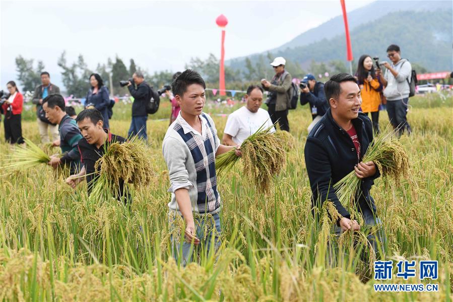 9月29日,人们参加拔谷穗比赛。9月29日,云南省寻甸回族彝族自治县2018年首届农民丰收节暨第二届摸鱼节在鸡街镇举行,当地农民和游客在丰收的稻田里进行摸鱼、拔谷穗、山歌对唱等活动,享受收获的喜悦。新华社记者杨宗友摄