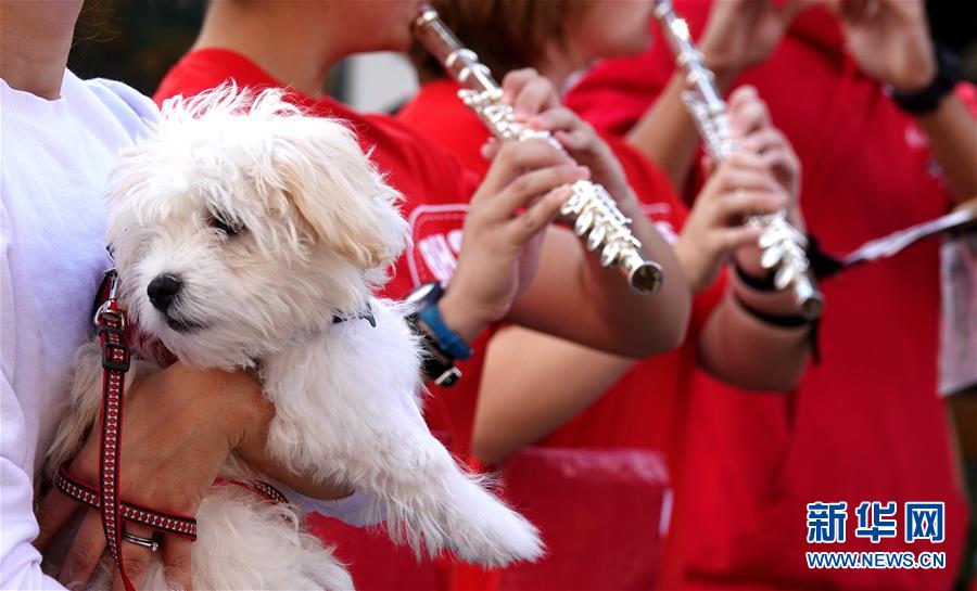 9月29日,在美国加利福尼亚州伯林盖姆市,一支学生乐队参加宠物狗大游行活动。美国加州旧金山湾区的伯林盖姆市29日举行宠物狗大游行活动。新华社记者吴晓凌摄
