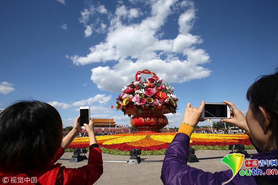 2018年9月29日,北京迎来高颜值好天气,天安门广场“祝福祖国”花坛在蓝天白云映衬下壮美如画。游客纷纷拿起手机、相机拍照留影充满节日气氛。