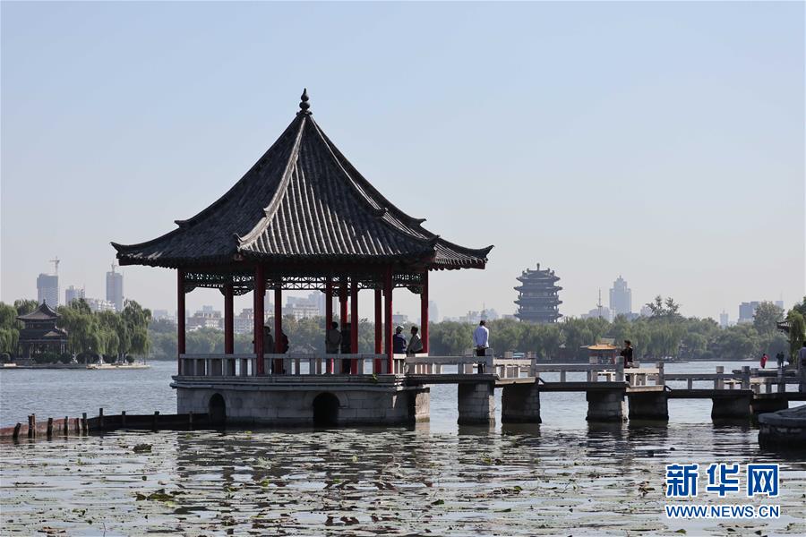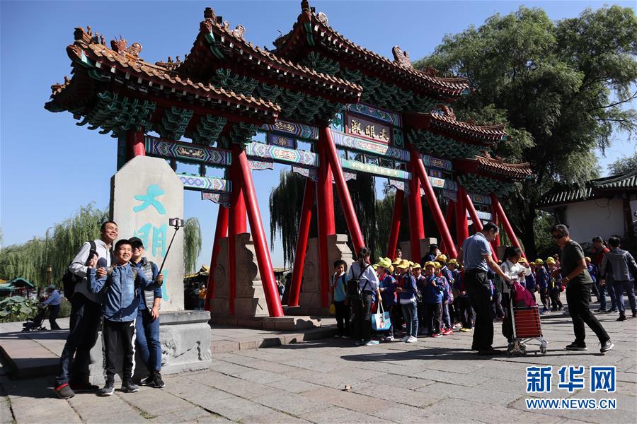 9月30日,游客在免费开放的济南市大明湖景区游览。近年来,山东积极推进国有景区免费开放工作,截至目前,山东实现免费开放的国有景区已达286处。新华社记者徐速绘摄