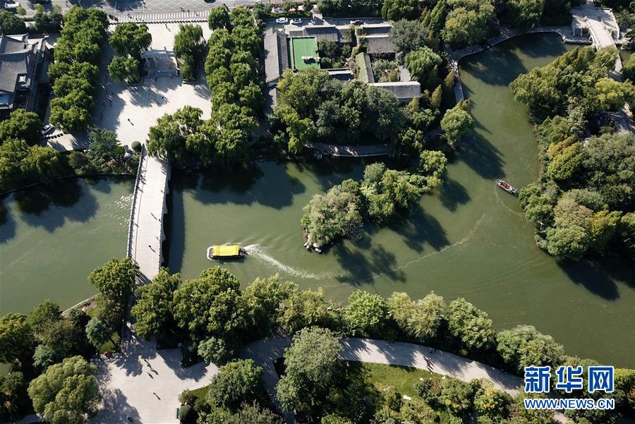 这是免费开放的济南市大明湖景区(9月30日无人机拍摄)。近年来,山东积极推进国有景区免费开放工作,截至目前,山东实现免费开放的国有景区已达286处。新华社记者徐速绘摄
