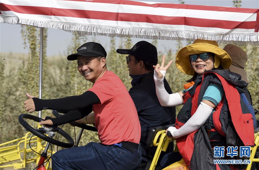 10月1日,游人在新疆和田市大漠胡杨景区游览。