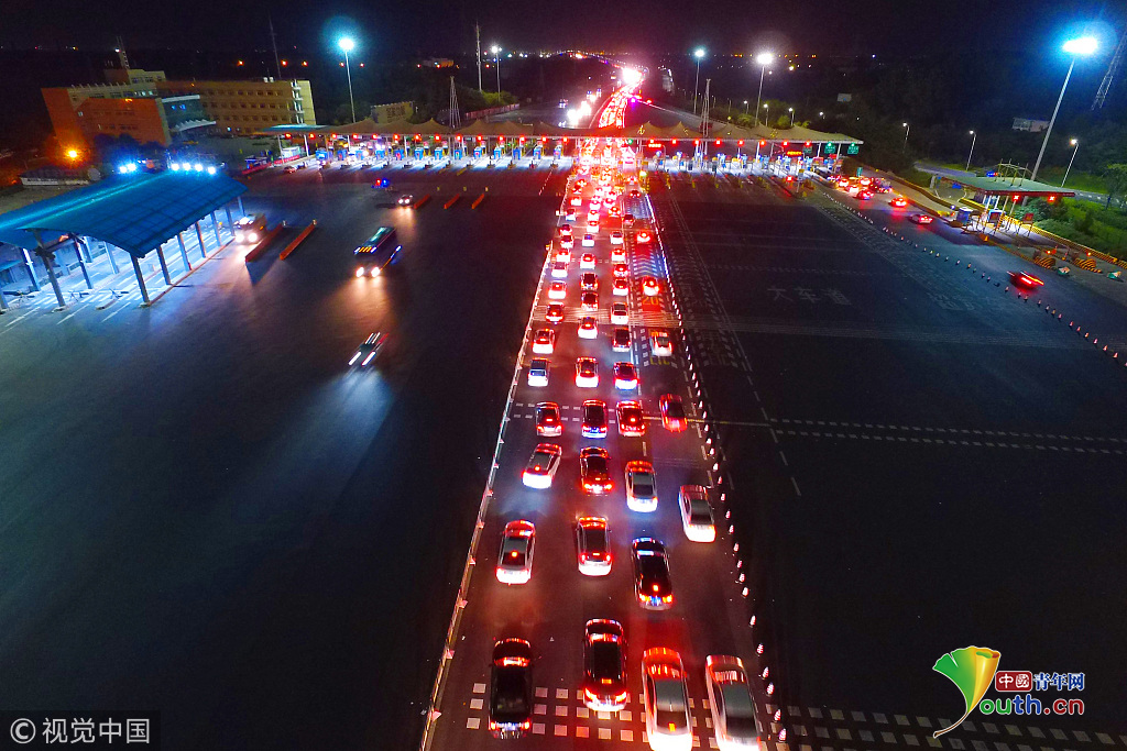 2018年10月1日,国庆假期首日凌晨1点左右,南京迎来出行高峰,所有高速公路出城方向迎来大批车辆,航拍南京长江二桥收费站,大量车辆排起长龙,场面尤为壮观。图片作者:方东旭