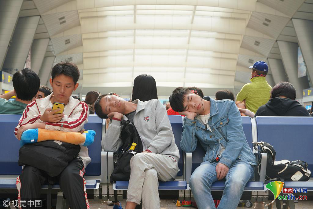 2018年10月1日,两名旅客在北京南站内候车时打盹。当天是国庆假期首日,北京南站迎来客流高峰。此前,据北京铁路局预计,国庆黄金周将发送旅客1168万人,同比增加19.9万人。其中10月1日为出行高峰日,预计当天发送旅客143万人,同比增加4.7万人。图片作者:张兴龙