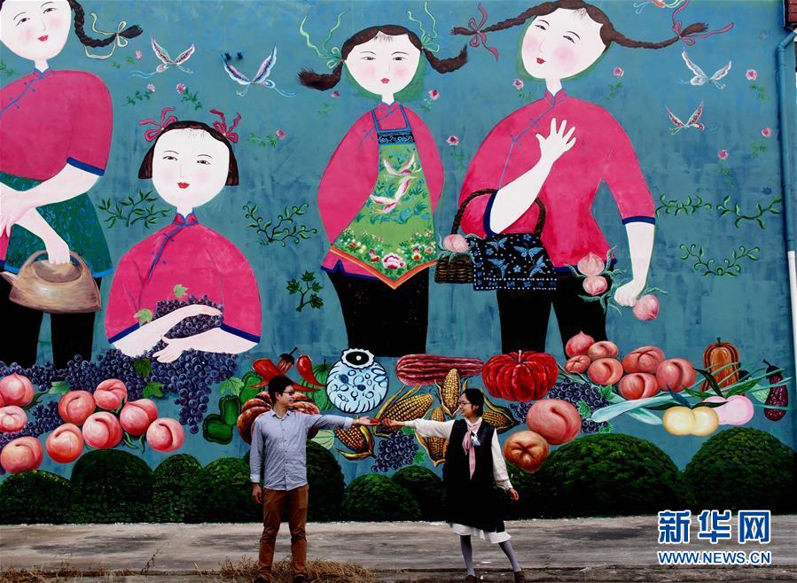 10月1日,游人在和平村的民居壁画前留影。新华社记者任珑摄