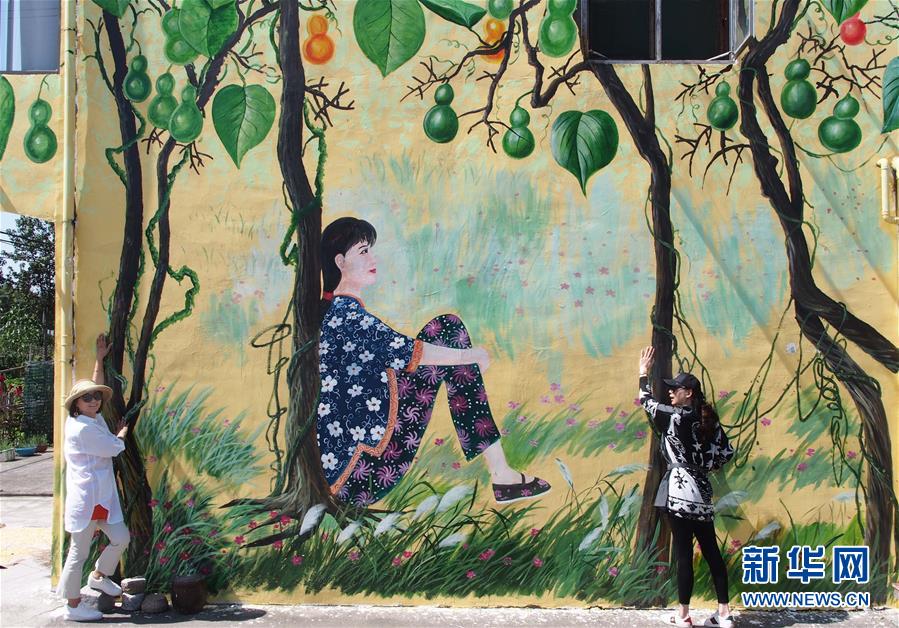10月1日,游人在和平村的民居壁画前留影。新华社记者任珑摄