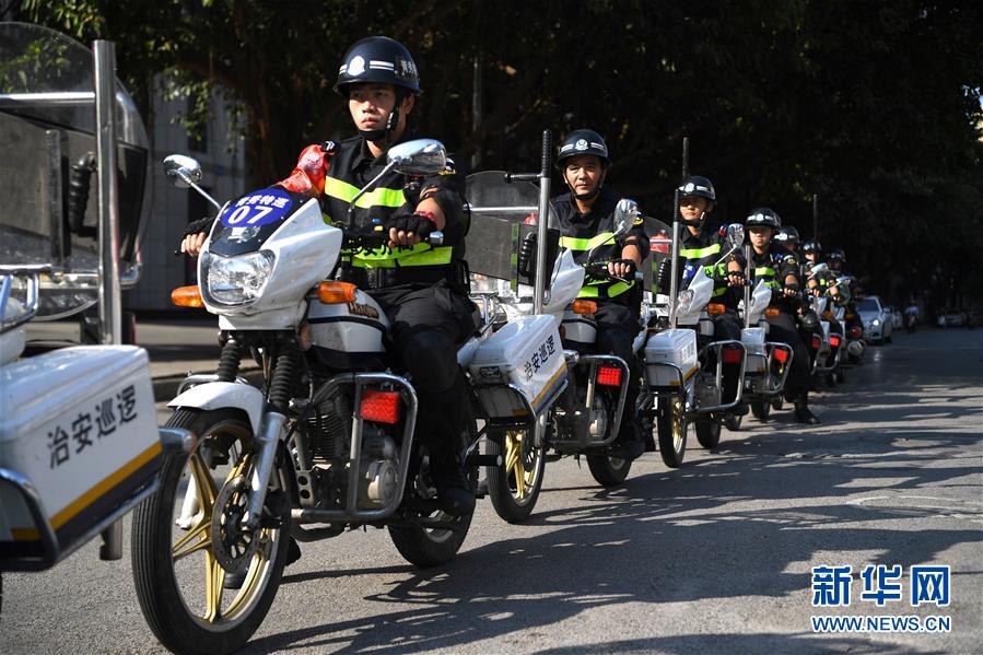 10月1日,广西南宁市公安局南湖分局治安巡逻队在南宁市东葛路上巡逻。当日是国庆节,许多劳动者坚守在工作一线,在岗位上度过节日。新华社记者周华摄