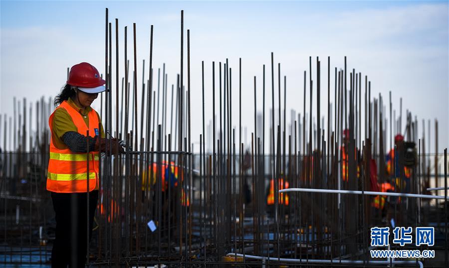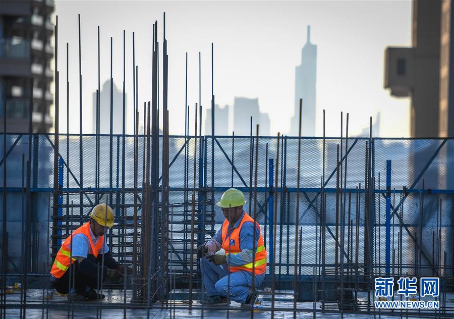 10月1日,中建三局三公司建筑工人在南京世茂外滩新城项目现场施工。当日是国庆节,许多劳动者坚守在工作一线,在岗位上度过节日。新华社记者李响摄