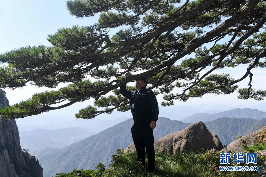 10月1日,安徽黄山风景区管委会园林局迎客松专职守护人胡晓春在对迎客松进行巡查。当日是国庆节,许多劳动者坚守在工作一线,在岗位上度过节日。新华社记者张端摄