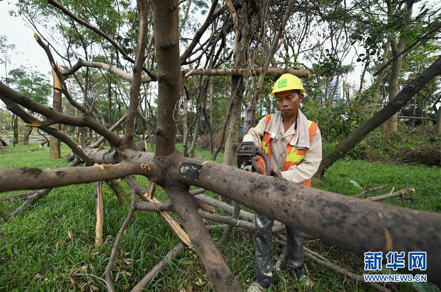 10月1日,工作人员在深圳街头的绿化带清理强台风“山竹”损毁的树木。当日是国庆节,许多劳动者坚守在工作一线,在岗位上度过节日。新华社记者毛思倩摄