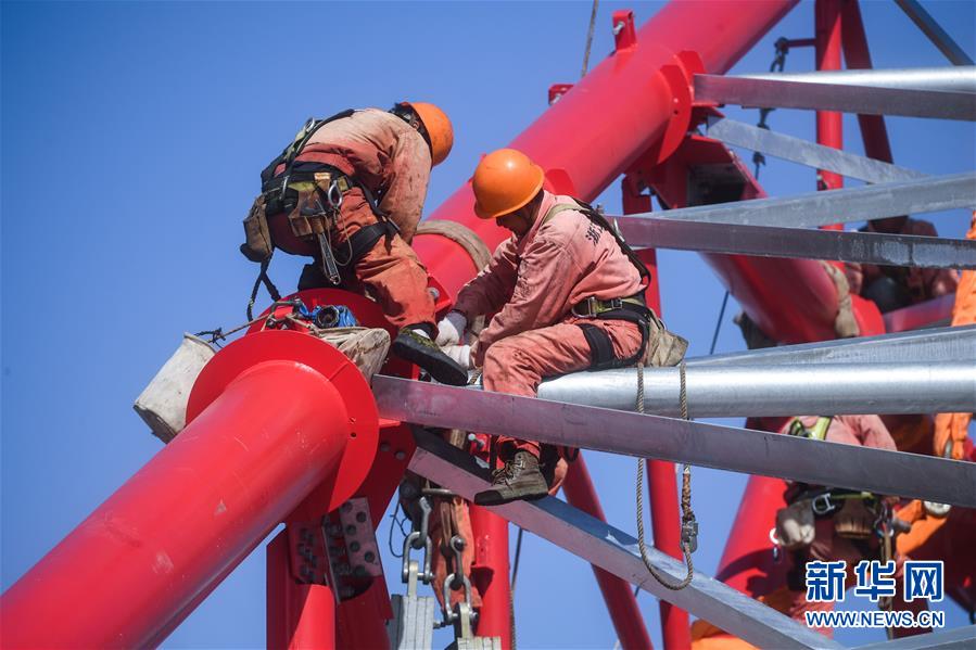 10月1日,工作人员在浙江舟山500千伏联网输变电工程金塘岛380米输电铁塔上施工。当日是国庆节,许多劳动者坚守在工作一线,在岗位上度过节日。新华社记者徐昱摄