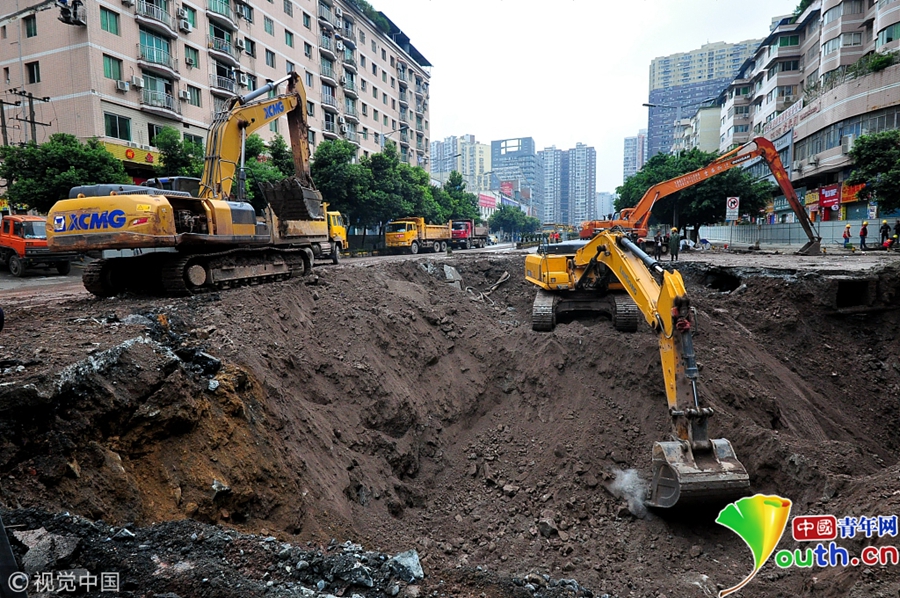 中国青年网北京10月9日电 2018年10月8日消息,四川达州。10月8日从四川省达州市达川区委宣传部获悉,7日14时30分左右,达川区东环南路103号人行道路面发生塌陷险情,经调取视频监控和走访周边群众,救援人员初步判断疑似有4人掉入坑中。图片作者:视觉中国