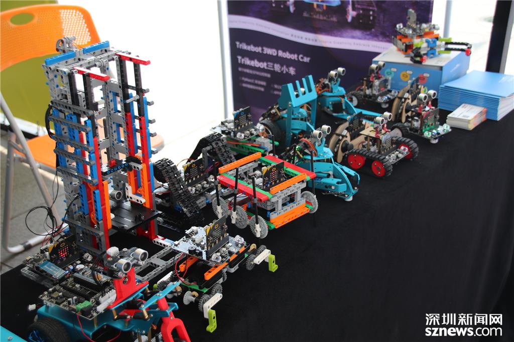 针对小朋友教育的小机器人可以自行组装、编程,图为展位前的教育小机器人