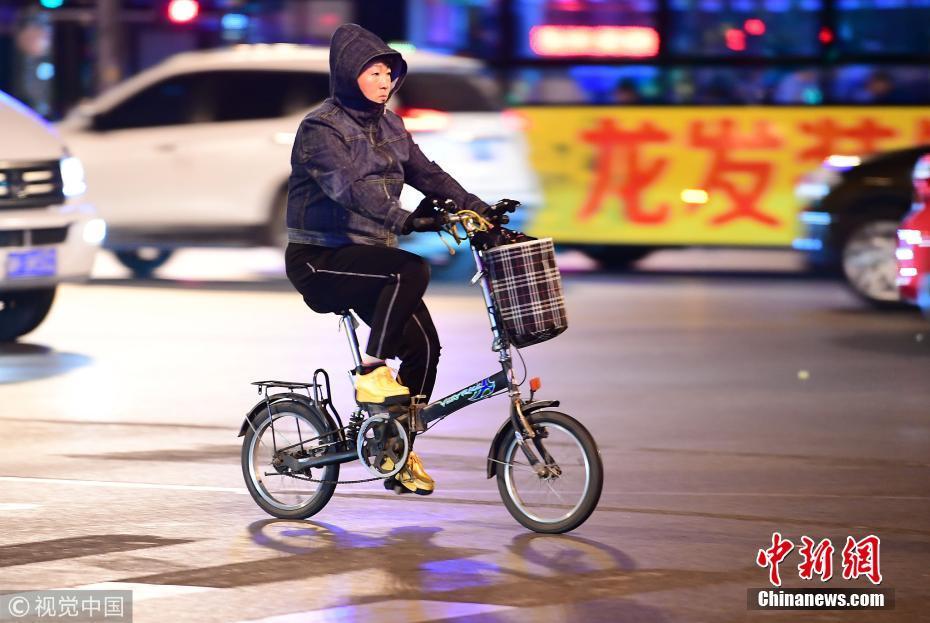 沈阳气温突降逼近冰点 市民棉衣出行