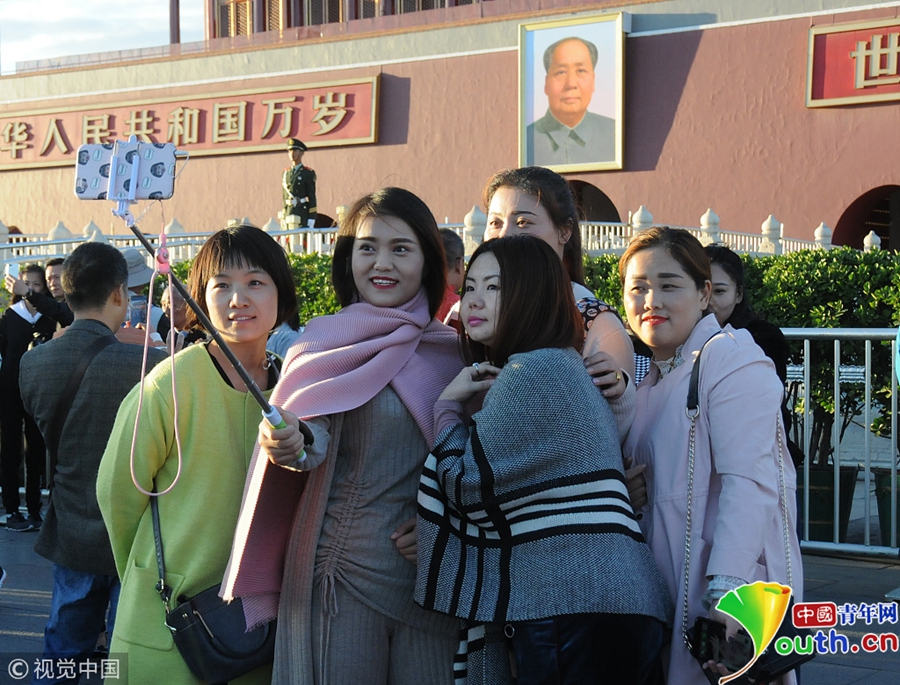 北京冷空气来袭 游客纷纷着秋冬装游览天安门