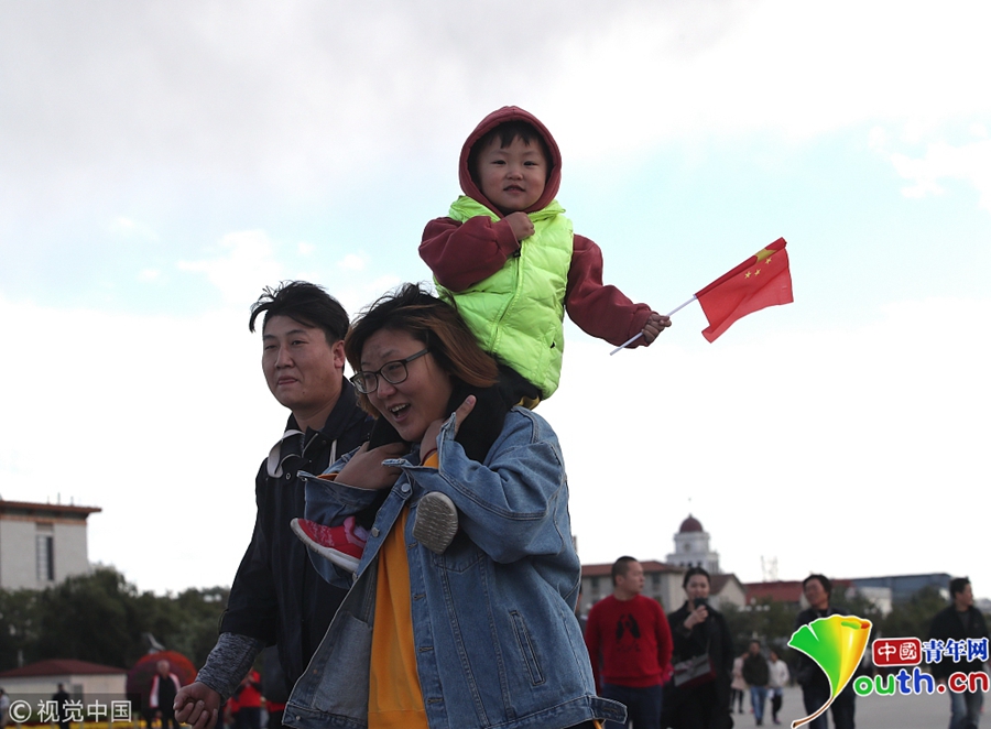 北京冷空气来袭 游客纷纷着秋冬装游览天安门