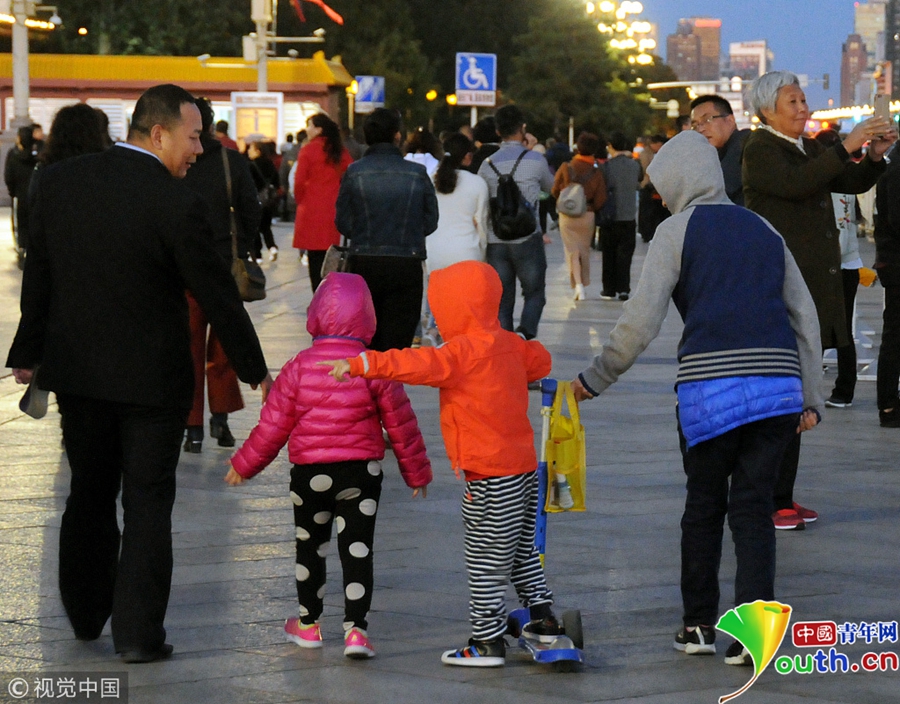 北京冷空气来袭 游客纷纷着秋冬装游览天安门