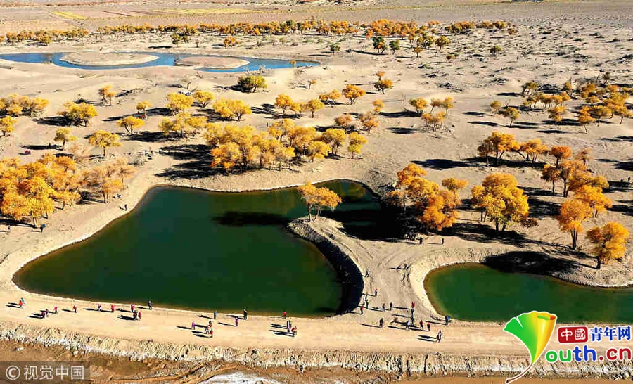 中国青年网北京10月9日电 2018年10月7日至8日,内蒙古自治区阿拉善盟额济纳旗,地处巴丹吉林沙漠。额济纳河两岸壮观的胡杨林堪称大漠的一颗绿色明珠,每年深秋时节的第一场秋霜过后,大片的胡杨树叶由绿变黄,一眼望去,阳光下金色的树叶衬着湛蓝的天空于风中婆娑起舞,鲜明的影调,亮丽的色彩,令人流连忘返。