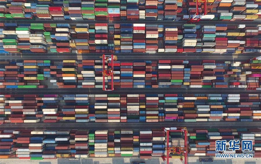 这是上海洋山深水港四期自动化码头(7月25日无人机拍摄)。 位于杭州湾口外的上海洋山深水港区,由大、小洋山等数十个岛屿组成,是中国首个在海岛建设的港口。洋山港西北距上海市南汇芦潮港约32公里,南至宁波北仑港约90公里,距国际航线仅45海里,是距上海最近的深水良港。 得益于洋山深水港的规划建设和多年发展,目前上海港与全球214个国家和地区的500多个港口建立了集装箱货物贸易往来,国际班轮航线遍及全球各主要航区。2017年,上海港集装箱吞吐量首次突破4000万标准箱,完成4023.3万标准箱,同比增长8.3%,均创历史最高水平。 新华社记者 丁汀摄