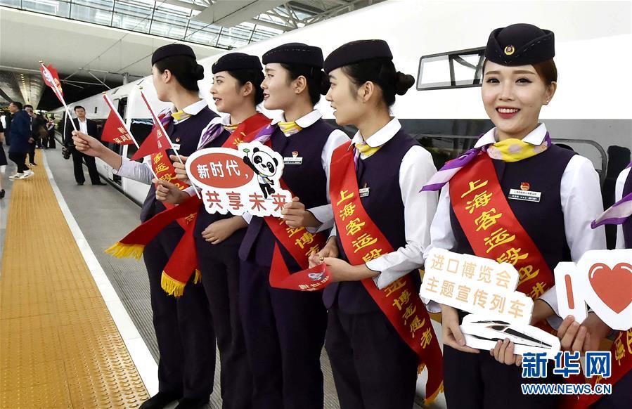 当日,首列复兴号“进口博览会主题宣传列车”从上海虹桥站发车。这辆满载着此次盛会“知识点”和“信息量”的高铁列车,将在京沪高铁线上运行,成为进口博览会的“流动宣传窗”。