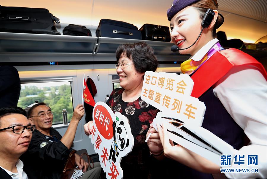 10月10日,G2次列车乘务员向旅客讲解首届中国国际进口博览会相关信息。 新华社记者陈飞摄