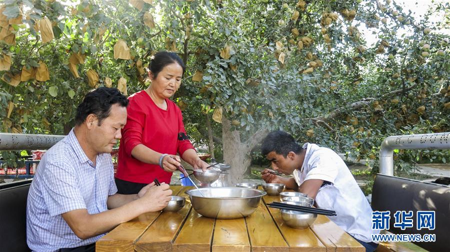 甘永军(左一)在地处新疆阿克苏地区柯柯牙绿化工程内的果园吃饭(2017年9月22日摄)。10年前,甘永军还在果园开起了第一个农家乐,带动周边100多户果农经营起了自家庭院。 在世界第二大流动性沙漠——塔克拉玛干沙漠西北边,一条逾百万亩的人工林带傲然挺立。 这条林带就是柯柯牙荒漠绿化工程。它是新疆阿克苏黄沙漫漫和碧波万顷的分界岭。 1986年,为改变恶劣的自然条件,阿克苏启动柯柯牙绿化工程。30年间,各族干部群众携手奋斗,曾是沙尘暴策源地的柯柯牙绿树成荫;并以此为原点,在南疆戈壁荒滩上孕育出百万亩的“绿海”。 30多年来,阿克苏打造出“人走政不息”的样本,使绿色发展理念成为几代人的广泛共识;“自力更生、艰苦奋斗、无私奉献”的柯柯牙精神,已融入各族儿女血液中;“以林养林”“边绿化边脱贫”的绿化、脱贫方式,给其他荒漠地区贡献了“柯柯牙智慧”。 新华社记者 杜刚 摄