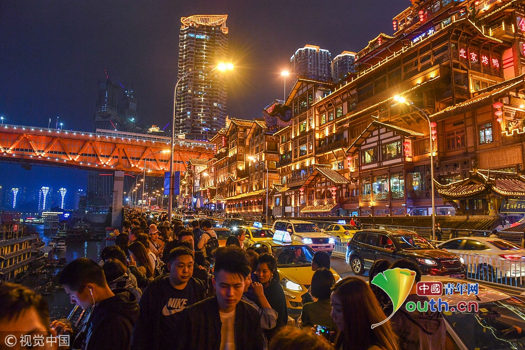 2018年10月8日,重庆,国庆长假结束后,山城网红景点洪崖洞依然处于暴挤状态,在抖音等短视频平台走红以后,绚烂辉煌的洪崖洞夜景成为赴渝旅行第一打卡景点。