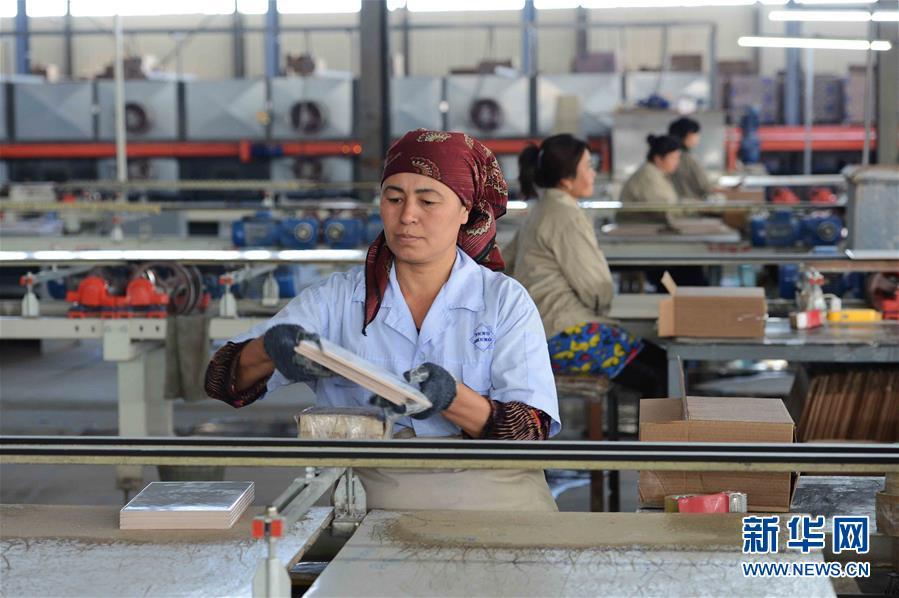 2017年5月1日,工人在位于乌兹别克斯坦锡尔河州的鹏盛工业园区瓷砖生产车间工作。鹏盛工业园是中国民营企业直接在乌投资建立的首个中乌合资工业园区。