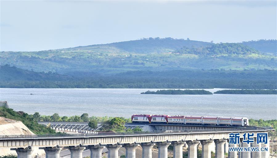 2017年5月29日,一列肯尼亚蒙内铁路测试列车行驶在蒙巴萨特大桥上。由中国承建的蒙巴萨-内罗毕标轨铁路(蒙内铁路)全长约480公里,于2017年5月通车。