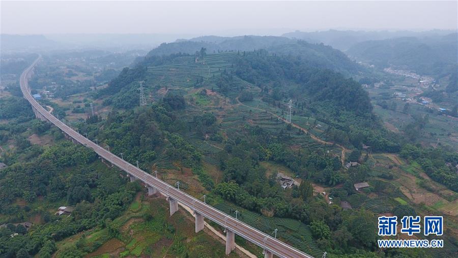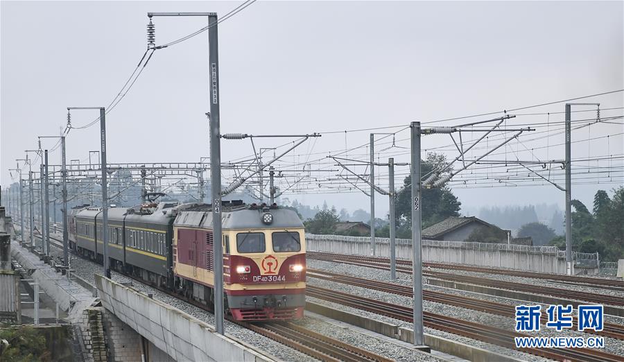 10月14日,试验列车在位于成都市蒲江县境内的成雅铁路成朝段上行驶。新华社记者薛玉斌摄