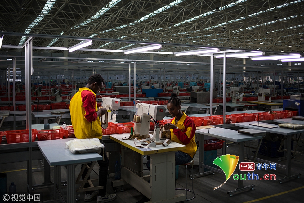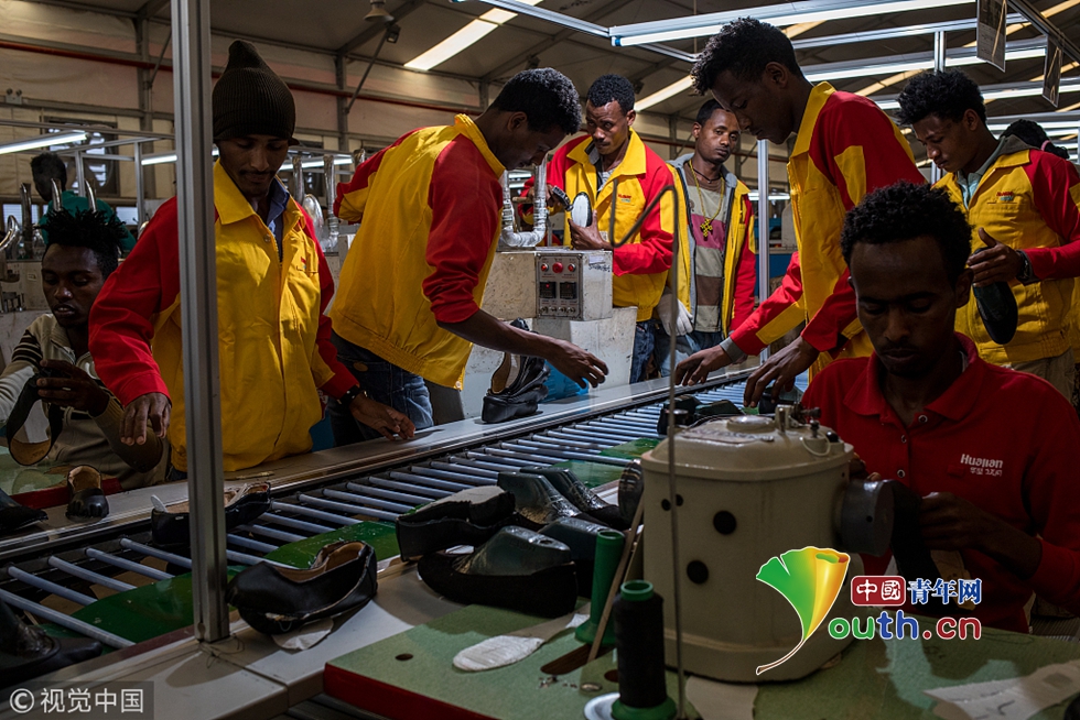 当地时间2018年8月1日,埃塞俄比亚。埃塞俄比亚首都亚的斯亚贝巴南部郊外,有一座东方工业园,这是中国在埃塞俄比亚的首个国家级境外经贸合作区。园区占地5平方公里,连接着两个60万人口的城镇,目前已经有85家企业入驻,行业涉及纺织、服装、制鞋、钢筋、水泥、制药、汽车组装等,这些企业绝大部分来自中国。图为鞋厂工人在2015年启用的新厂区内工作。