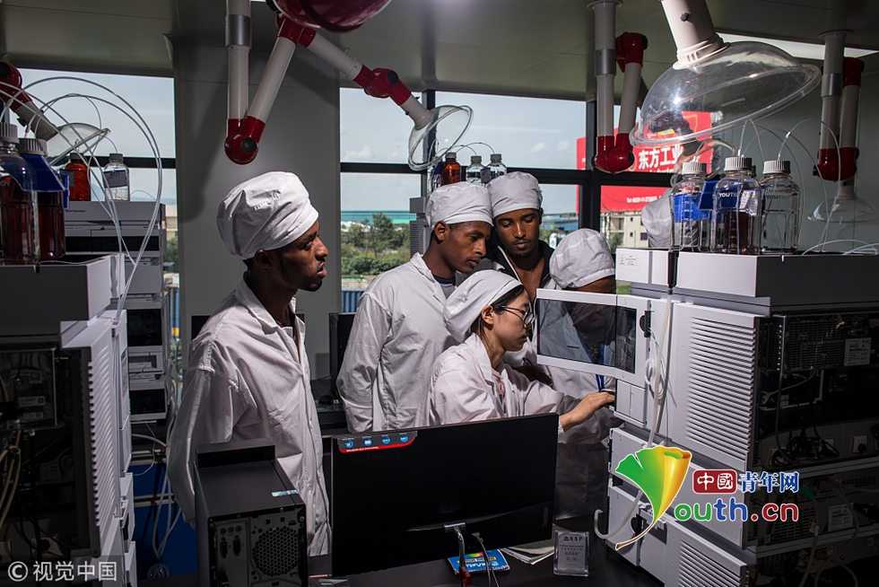 7月30日,埃塞俄比亚,首都亚的斯亚贝巴的东方工业园内一家中国制药厂,27岁的中国员工汪红梅为当地雇员讲解液相色谱器械使用要领。整个实验室共有4名中方员工和18名当地雇员。